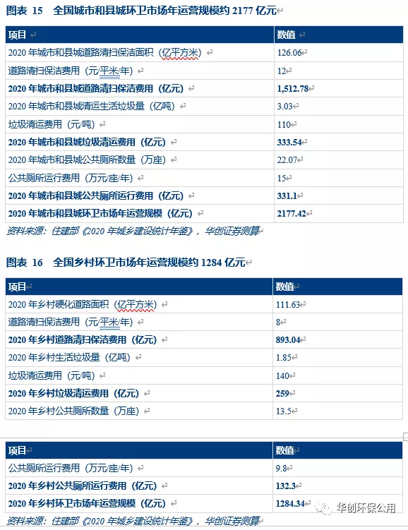 根據2020年中國城鄉建設統計年鑒,全國城市和縣城道路清掃保潔面積將達126.06億平方米,生活垃圾清運量約3.03億噸,公共廁所數量將達22.07萬座。將經典環衛項目的費用代入數據中,我們測算出全國城市和縣城環衛市場年運營規模約為2177.42億元。全國鄉村道路清掃保潔面積將達91.24億平方米,生活垃圾清運量約1.85億噸,公共廁所數量將達12.95萬座。同樣將以前經典環衛項目的費用代入數據中,我們測算出全國鄉村環衛市場年運營規模約為1284.34億元。加上此次垃圾分類帶來的空間提升,當前環衛市場規模約為3800億。
