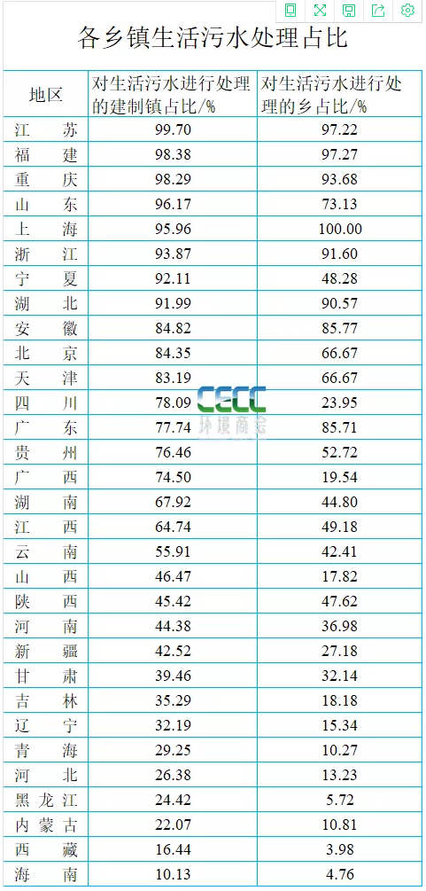 分省市來看,江蘇、福建、重慶、上海、浙江、湖北等6個省市90%以上鄉鎮生活污水實現處理,其他省市有不同程度缺口,具體如下: