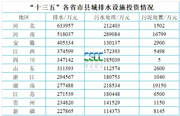 從省份來看,河北、河南、安徽等省份在縣城排水設施投入比較大,按排水投資額排名前十的省市具體情況如下: