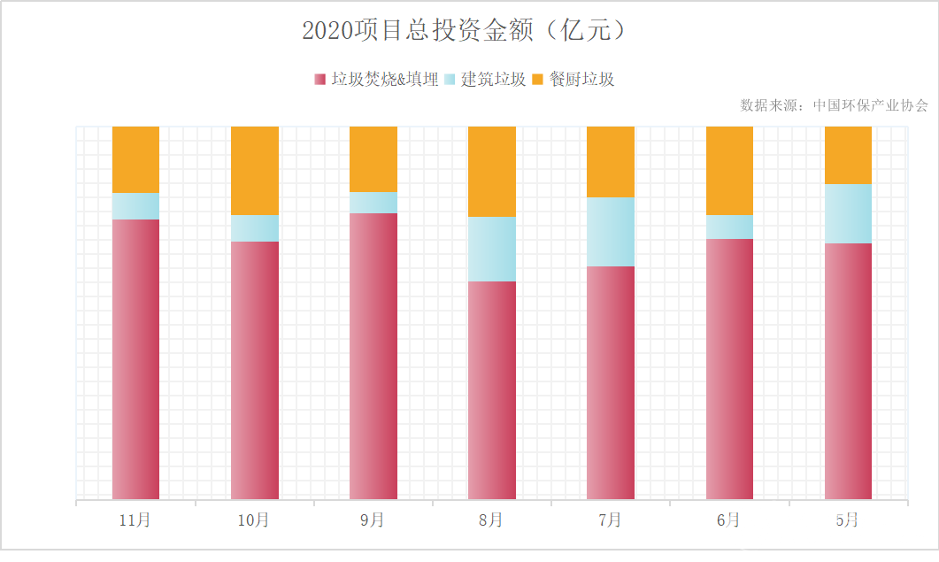 2020年前11個月,全國垃圾焚燒中標項目共計311項,總投資金額共計655.15億元;餐廚垃圾處理處置中標項目共計361項,總投資金額194.6億元;2020年5月到11月,全國建筑垃圾處理處置中標項目共計213項,總投資金額61.85億元。